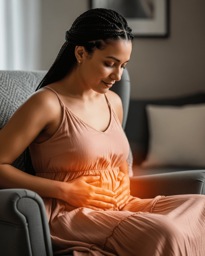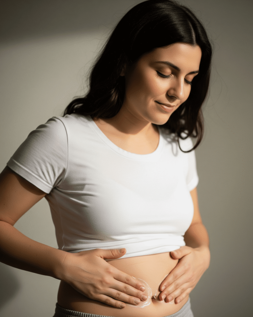 Aplicação localizada no ventre, nas costas ou em outras regiões, proporcionando sensação reconfortante na pele.